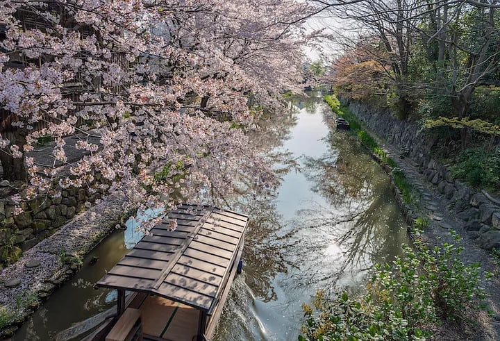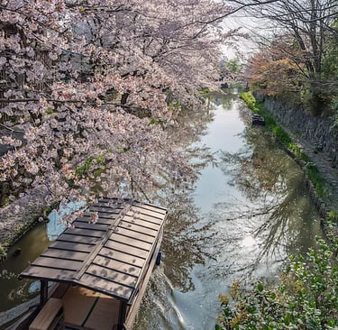 Embarquez pour une navigation silencieuse sur les canaux ombragés, découvrez comment ces voies d’eau façonnèrent l’essor économique de la ville et permirent le transport des soieries précieuses vers Kyoto.